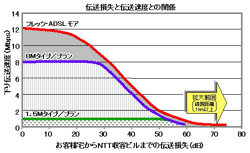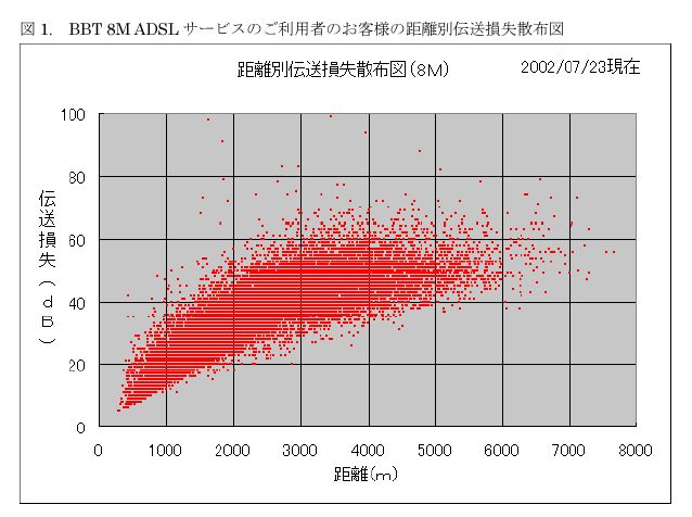 | ■絵手紙展 平成14年10月10日より **** ADSL特集 **** ■NTT東西 「フレッツ・ADSL モア」伝送距離延長 ![]() ■Yahoo! BB,ADSLの速度測定システムを公開 Yahoo! BB 8M ADSLユーザーの、NTT局舎からの回線距離(X軸)と損失データ(Y軸)の分布図 ![]()